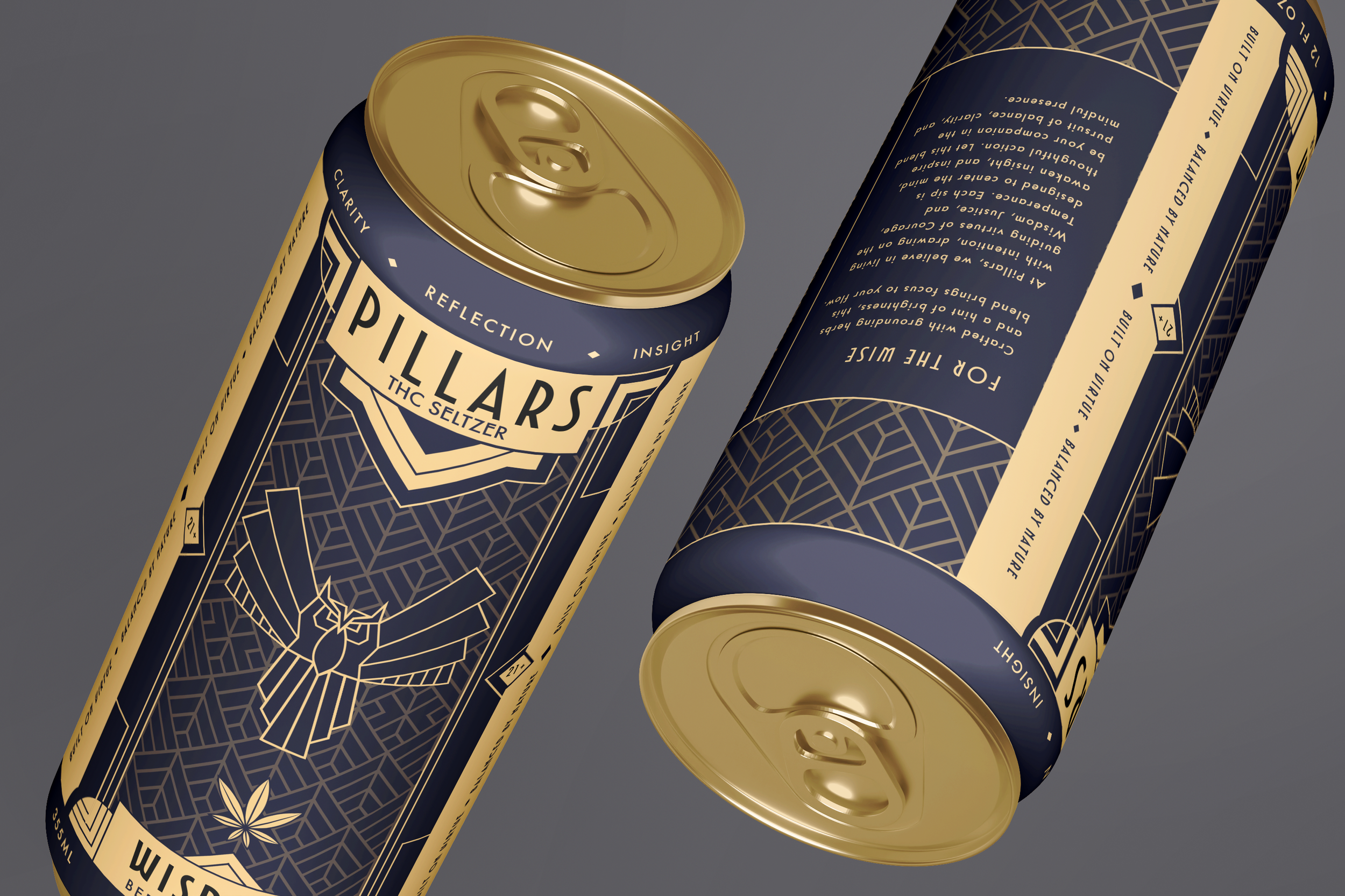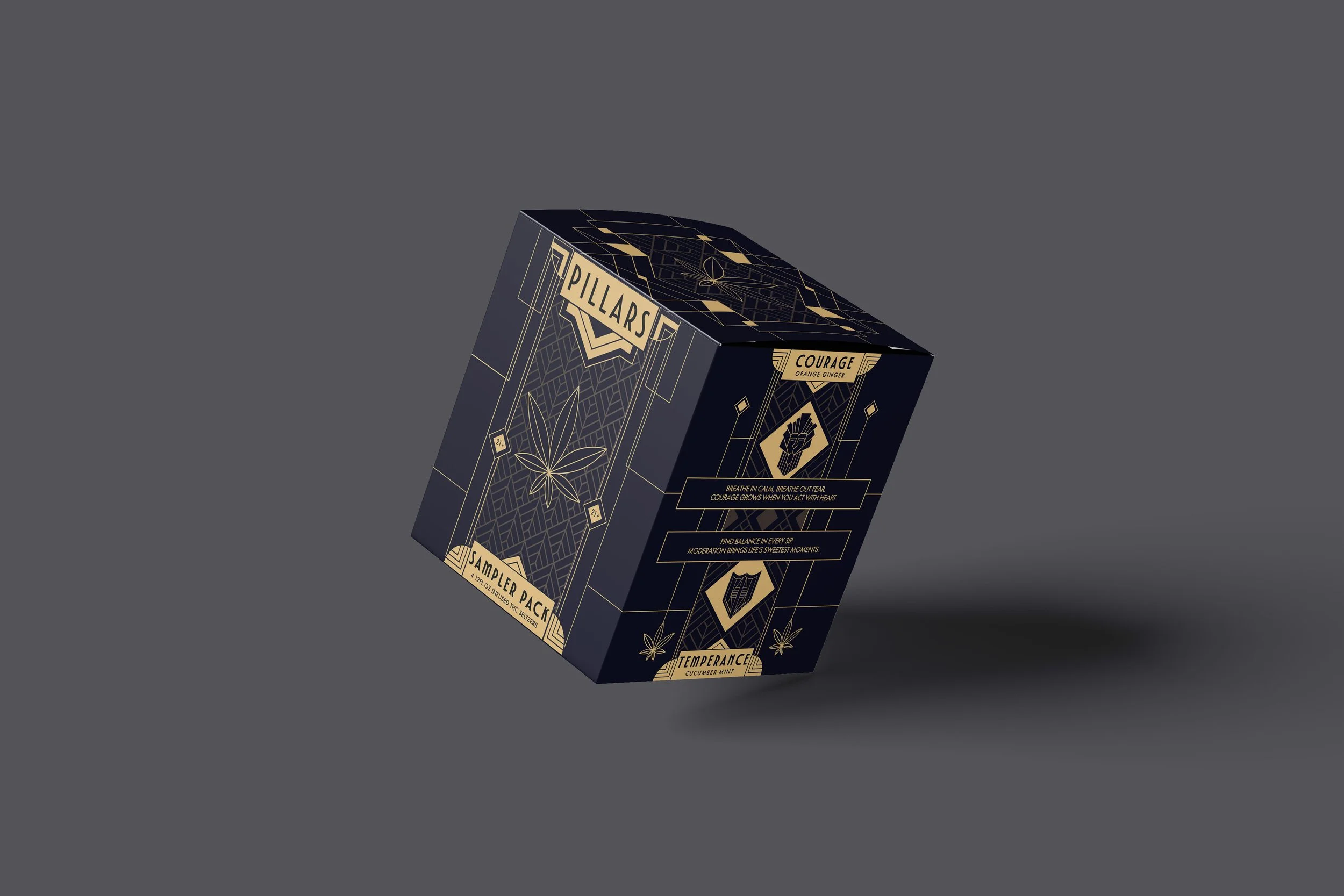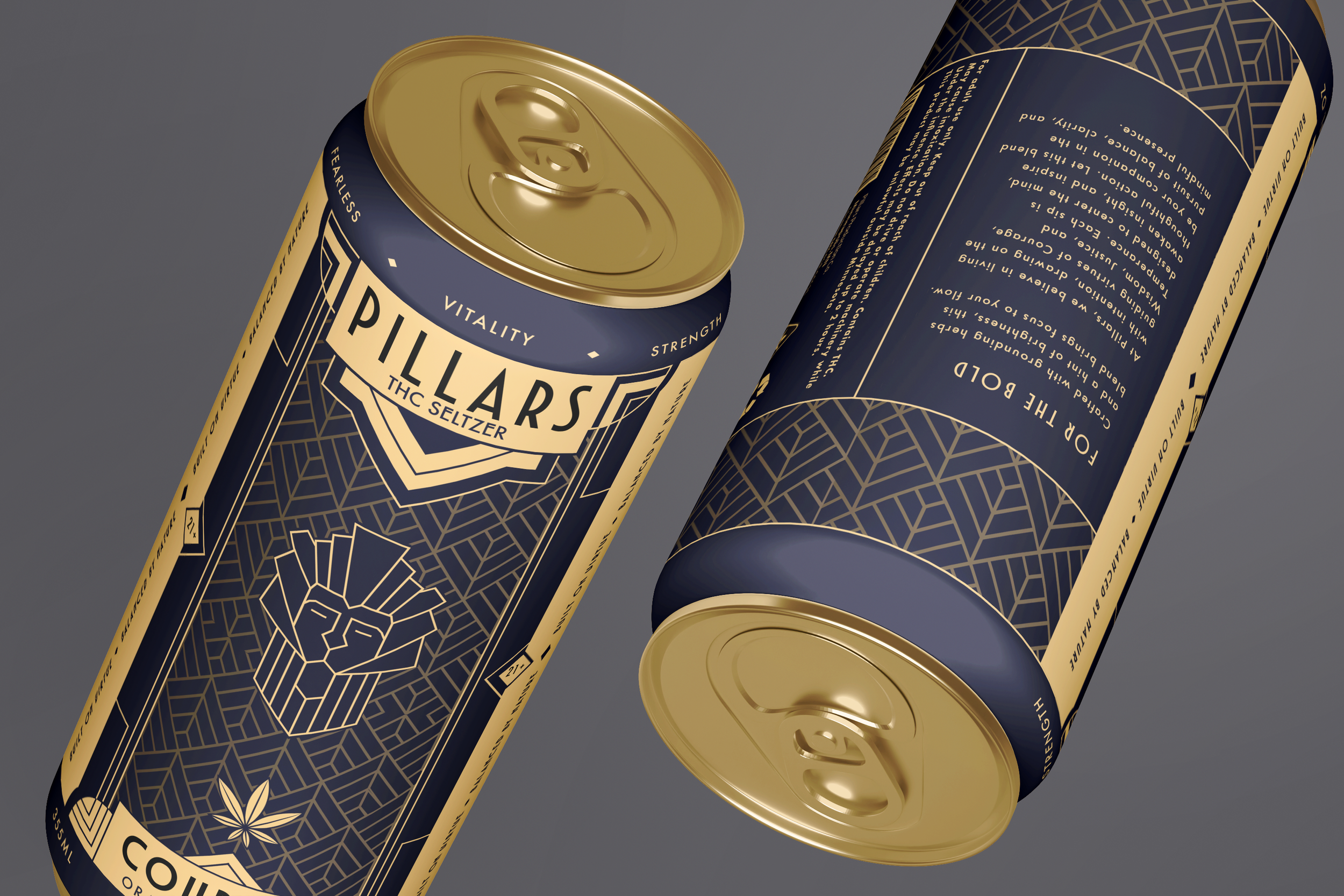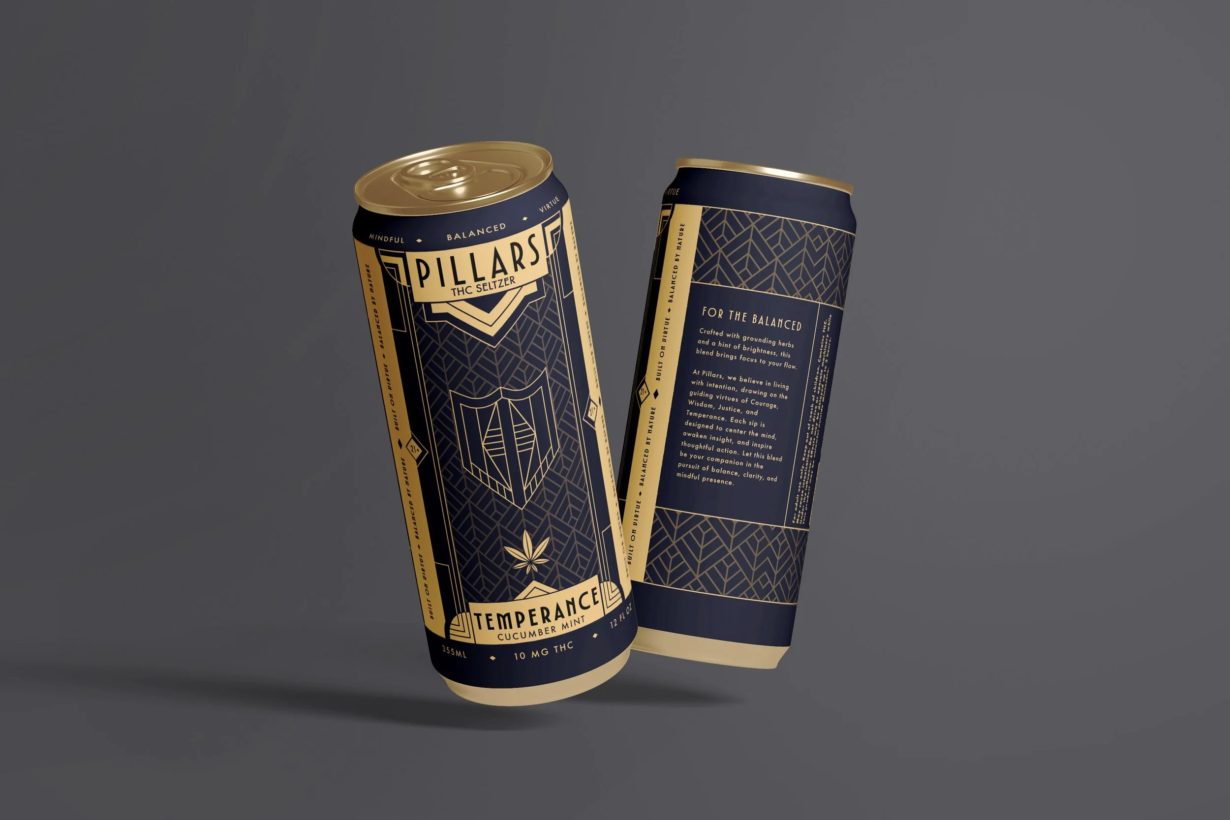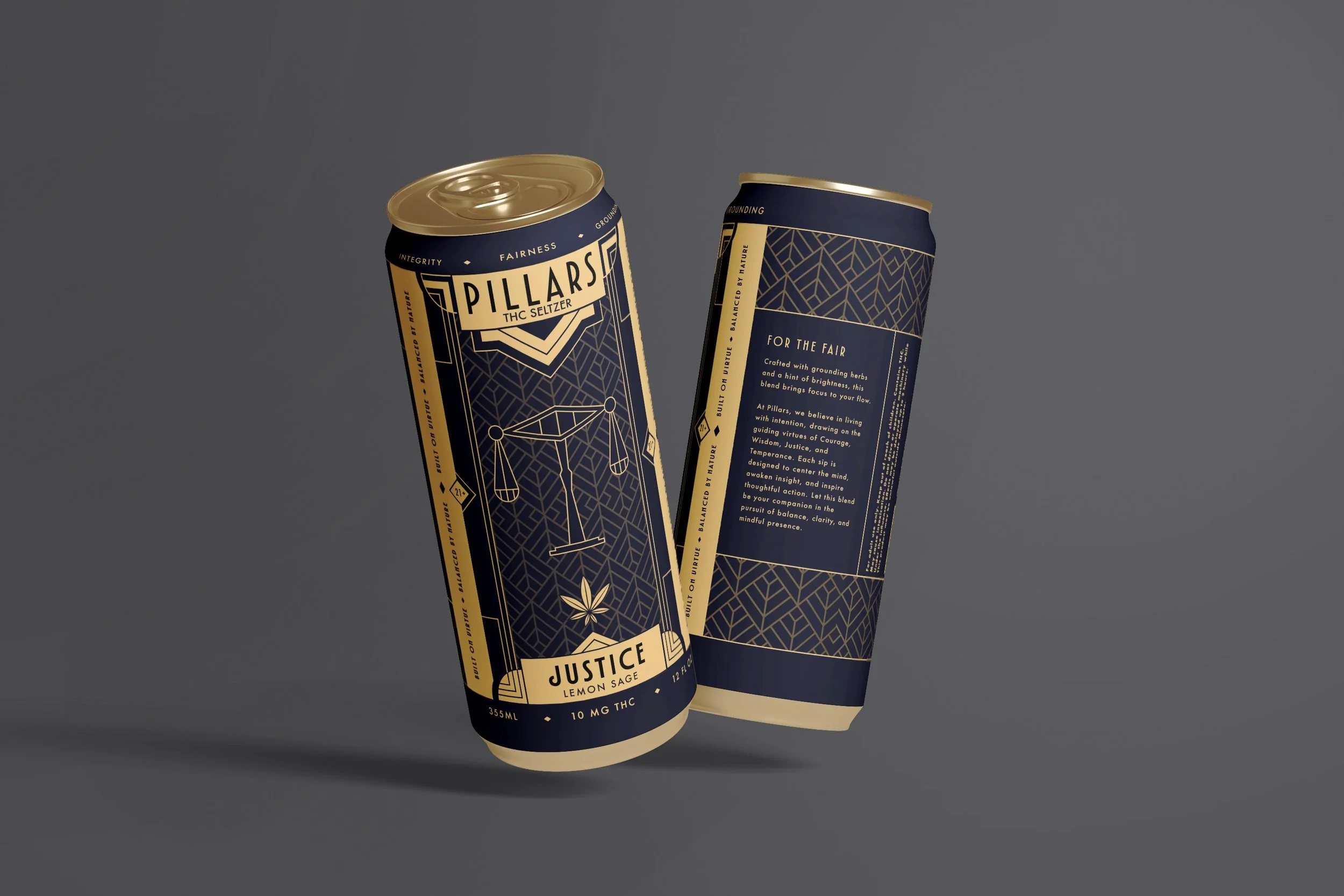 THC beverage brand inspired by the four classical virtues: Courage, Temperance, Justice, and Wisdom. The identity blends philosophical meaning with a refined Art Deco aesthetic to give the product a premium, architectural feel. Geometric lines, metallic accents, and structured symmetry make each flavor feel intentionally crafted and elevated.